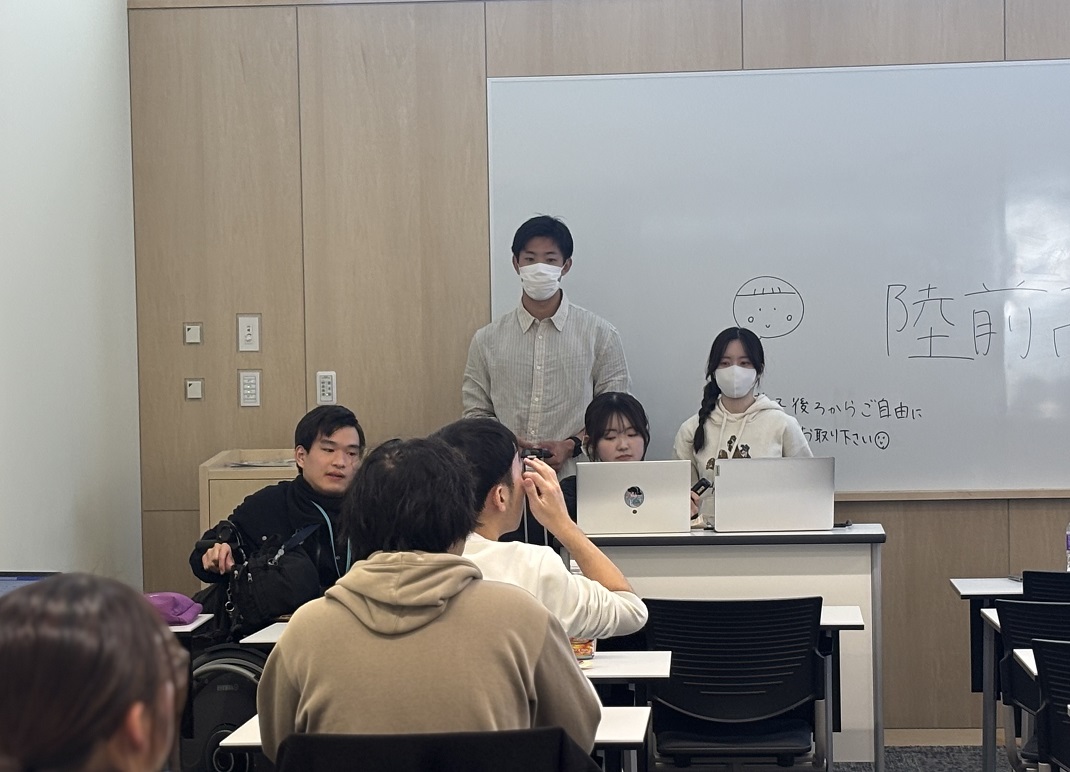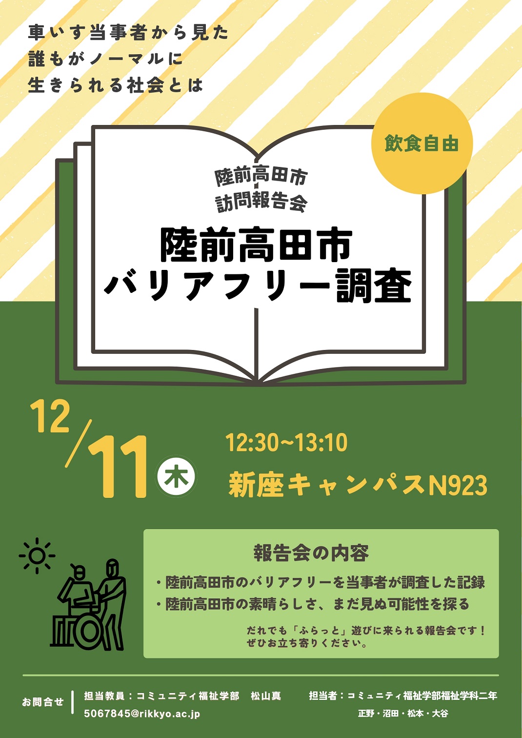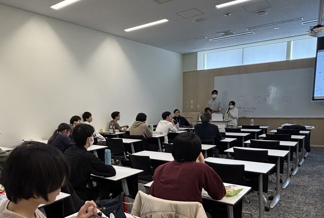 2025年12月11日(木)、あたたかい太陽の光が降り注ぐ昼時、新座キャンパス9号館N923教室にて、社会教育連携課 陸前高田サテライト事務局主催のもと、コミュニティ福祉学部の学生有志団体「ふらっとプロジェクト」による「陸前高田におけるバリアフリー調査報告会」を開催した。