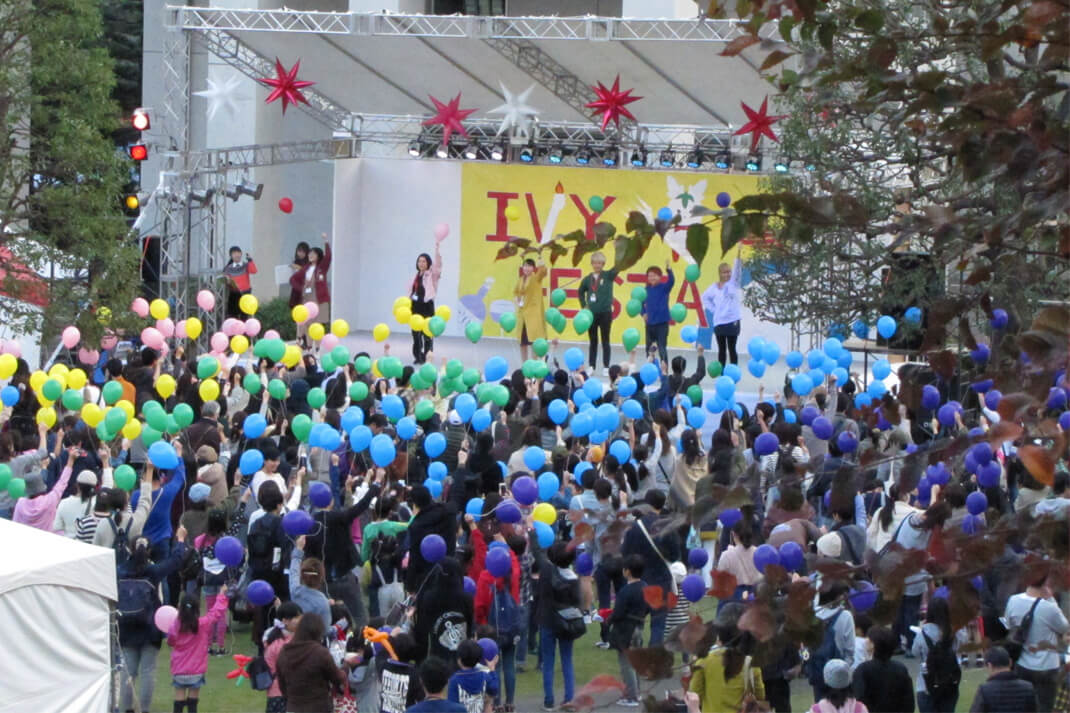 「IVY Festa」は、学⽣団体の活動発表の場であると同時に、地域との交流の場として、近隣の知名度も⾼く、近年は開催期間中にのべ10,000名を超える来場者を迎えます。ステージでのパフォーマンスや演奏、⼦どもたちが楽しめる企画なども充実し、「地域のお祭り」として親しまれています。
