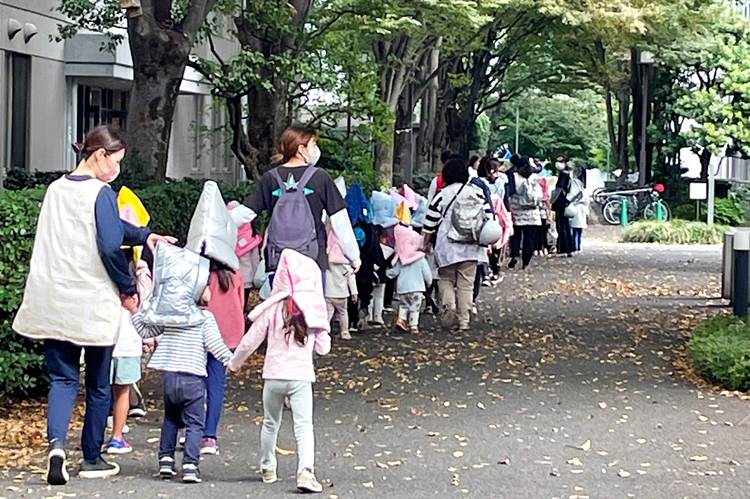 新座キャンパスは近隣地域の災害時の避難場所に指定されています。町内会、自治防災会などが、本学と協力の上、定期的に避難訓練および本学体育館で避難所設営訓練を行っています。写真は、近隣の保育園が毎年行っている避難訓練の様子で、園児100名ほどが、大学に避難します。