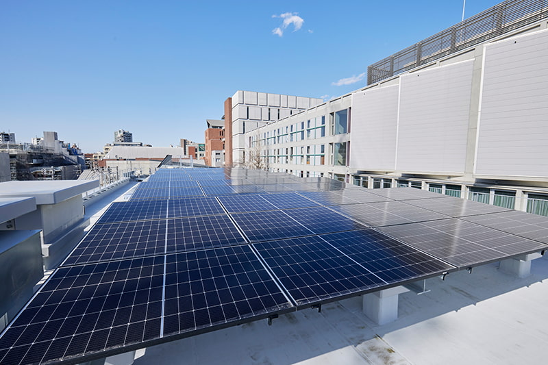 主要な構造体に木材を使用し、脱炭素社会への貢献を体現するとともに、内部空間にも木質化を積極的に取り入れています。また、屋上の太陽光パネルによる創エネ効果を館内のモニターで確認できるなど、環境技術を身近に感じる仕掛けが施されています。