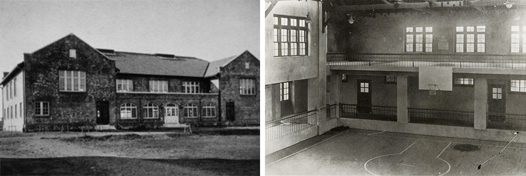(左)かつて池袋キャンパスにあったレンガ造りの体育館(外観・1921年)、(右)昔の体育館の内観(1922年)
