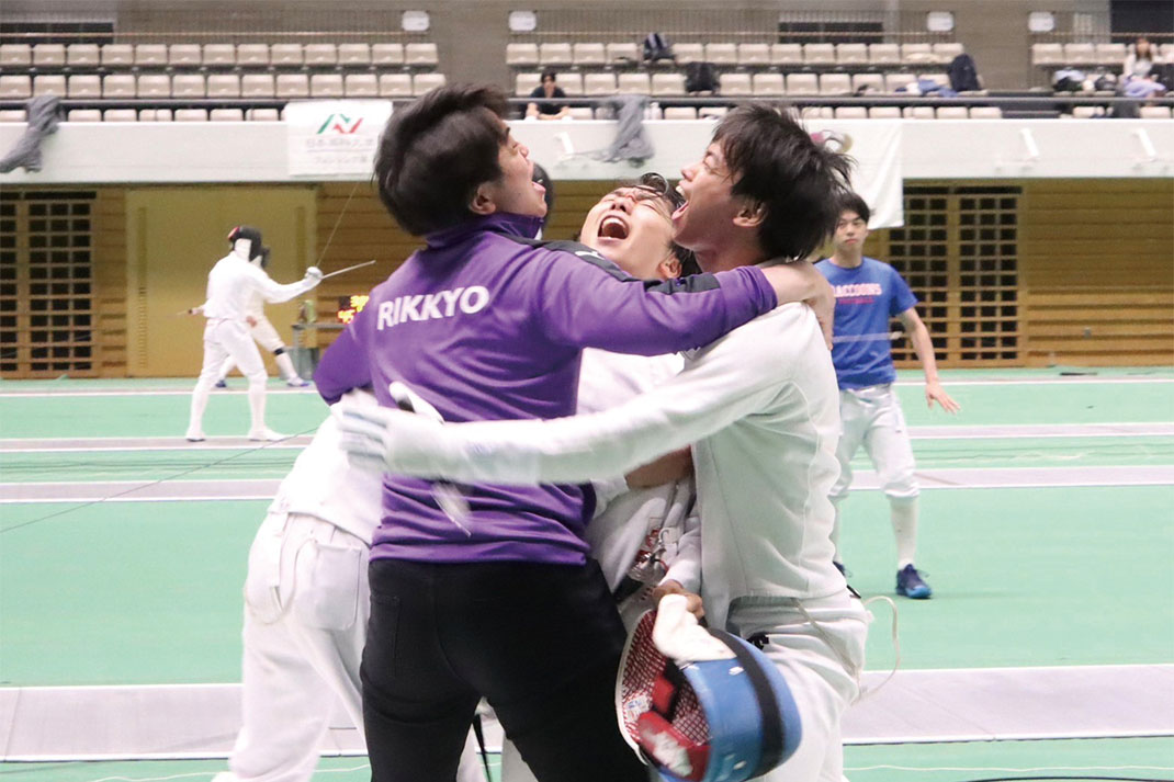 今や強豪校として注目を集める立教大学フェンシング部。その強さは、待機する選手たちやコーチの行動に表れていた。団体戦であっても、ピスト(競技台)に立つのは一人。信頼を寄せる仲間からは、「それで合ってる。点は気にするな!」「いつものお前のフェンシングで!」といった力強い声が飛び交う。試合中も、仲間の声援と共に全員で戦うのが立教のスタイルだ。勝利の瞬間には年齢や立場を超えて、全力で喜びを分かちあう。
