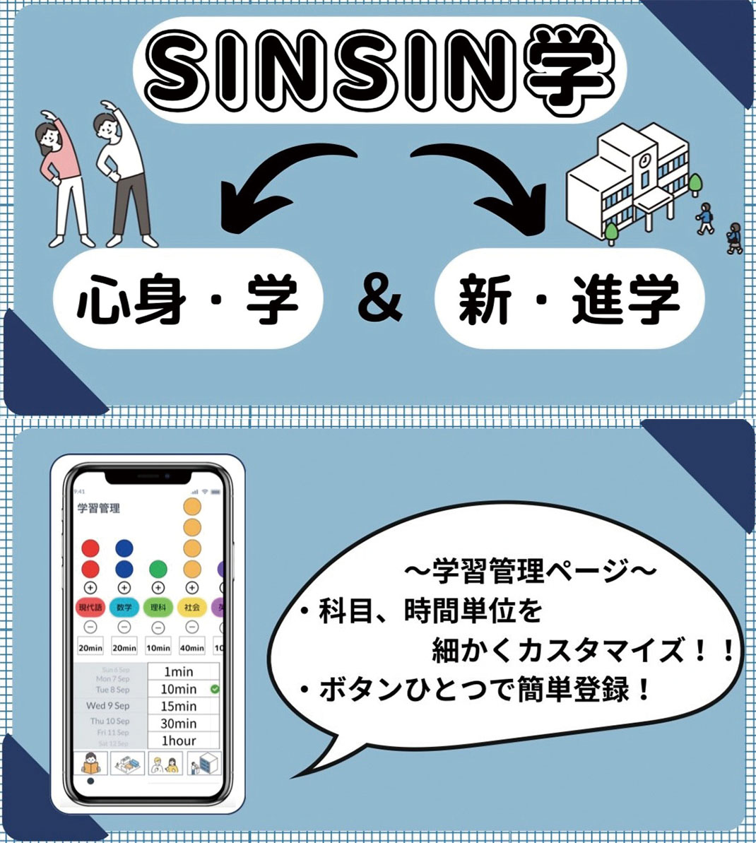 ※2 SINSIN学:「心身・学」と「新・進学」をかけたネーミングで、学習と生活の両面を一括管理できるアプリ。勉強時間だけでなく、睡眠や食事など日々の生活データを記録して心身のバランスをサポートする。