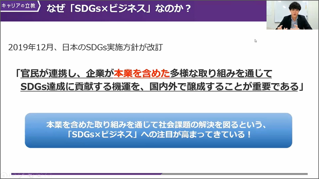 6月21日(火)、キャリアセンターによる全学生を対象としたキャリア・就職支援プログラム「【社会を知る講座】SDGs×ビジネスの真の融合に迫る」をオンラインで開催しました。