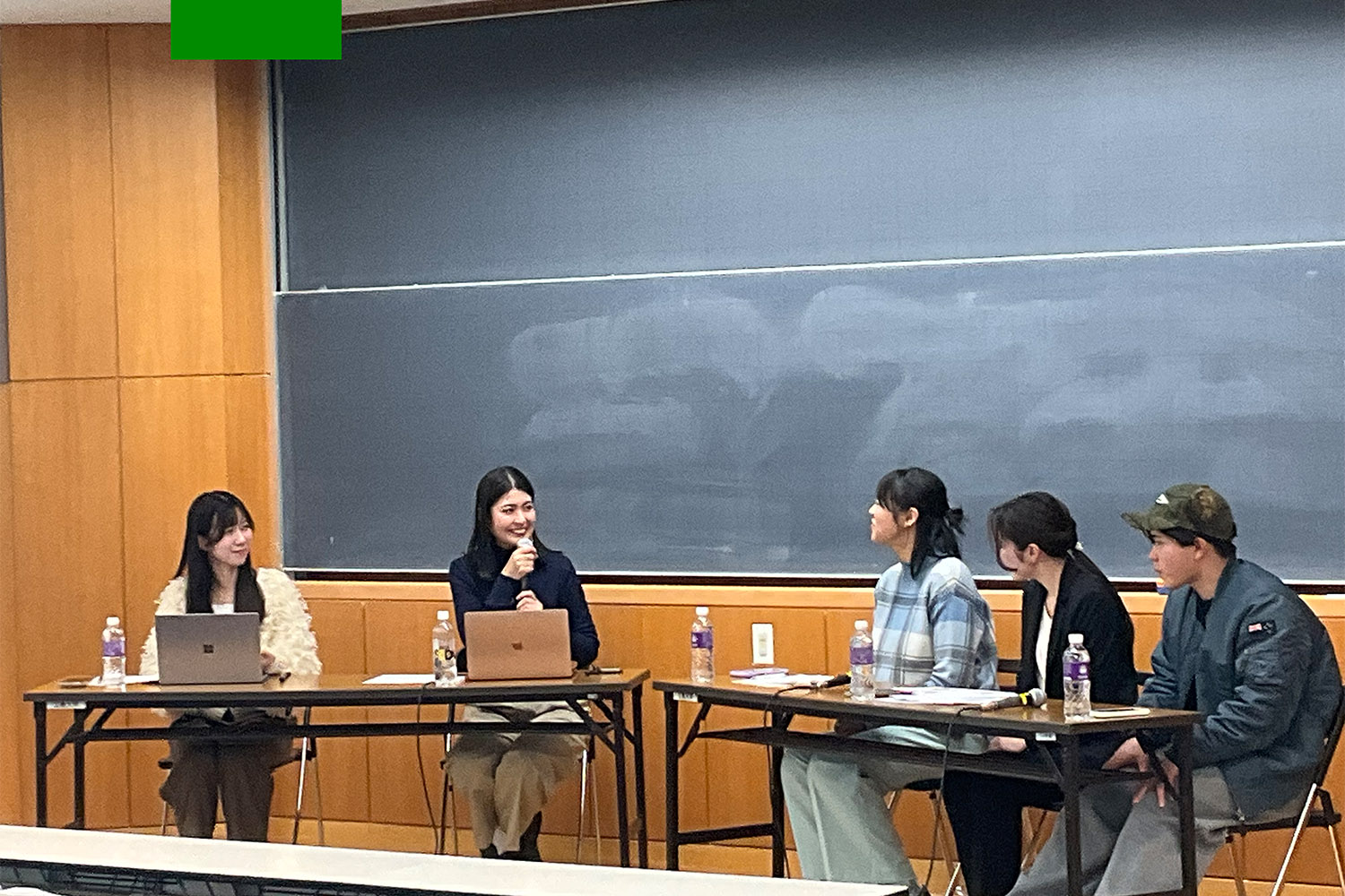 次に、パネルディスカッションでは、若山さんと本学部学生4名によって議論が行われました。ディスカッションのファシリテートは、4年次の飯田楓さんが務め、田中野乃香さん(4年次)、伊藤紗香さん(2年次)、千田直太朗さん(1年次)に登壇して頂き、それぞれの立場や経験から意見交換がなされました。ディスカッションの進行は、主に以下の3つのテーマで展開されました。