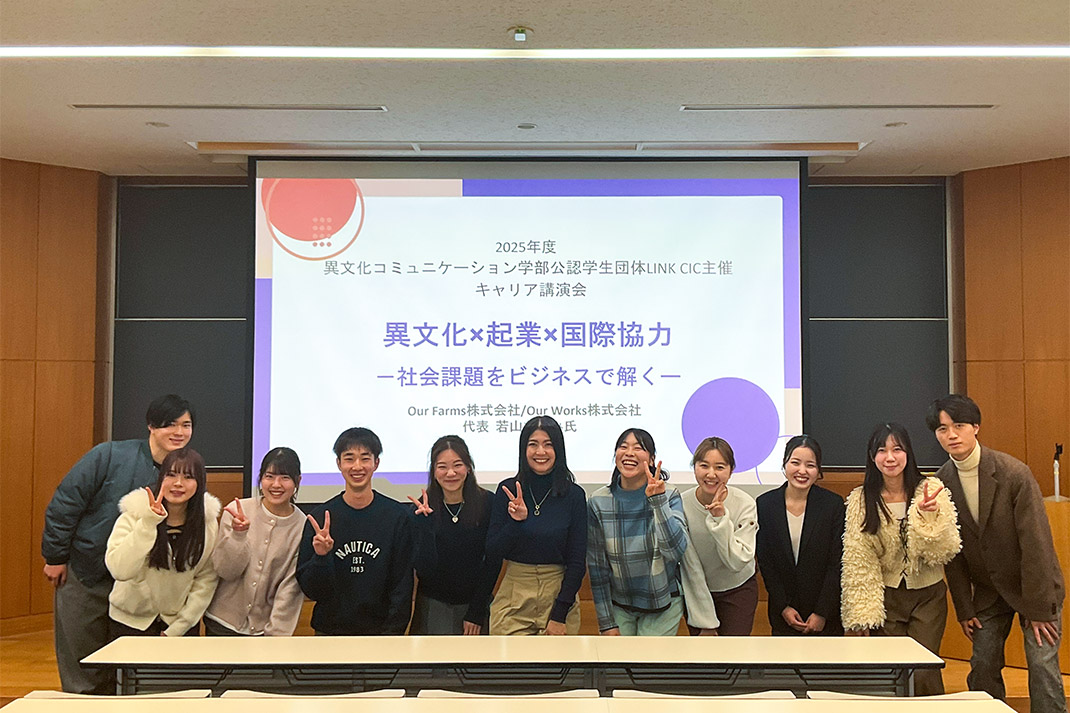 2026年1月19日、異文化コミュニケーション学部公認学生団体LINK CICが主催するキャリア講演会「異文化×起業×国際協力₋社会課題をビジネスで解く」が開催され、Our Farms株式会社・Our Works株式会社代表若山ななみさん(本学部2014年3月卒業)にご登壇いただきました。本講演会は、若山さんによるご講演、本学部生4名とのパネルディスカッション、質疑応答の3部構成で行われました。