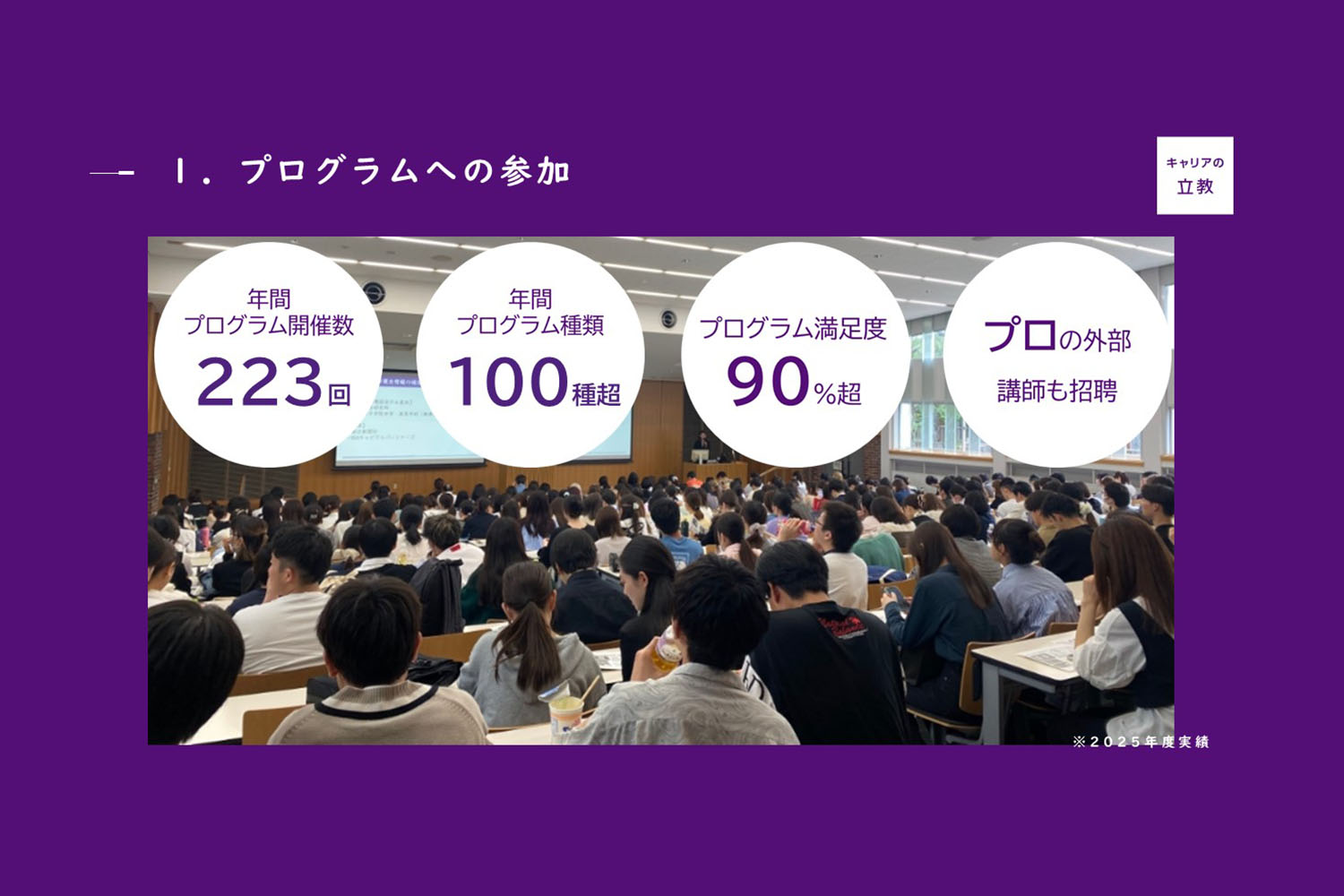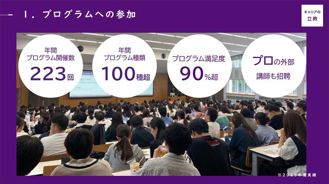 キャリアセンターでは100種類を超えるプログラムを、年間223回も開催しています。就職活動に直接役立つプログラムはもちろん、学年を問わずに参加できるプログラムまで多数展開しています。講師を外部に依頼する場合でも、内容については立教生のニーズや最新の就活動向を踏まえ、キャリアセンタースタッフが中心となって協力しながら作成しています。