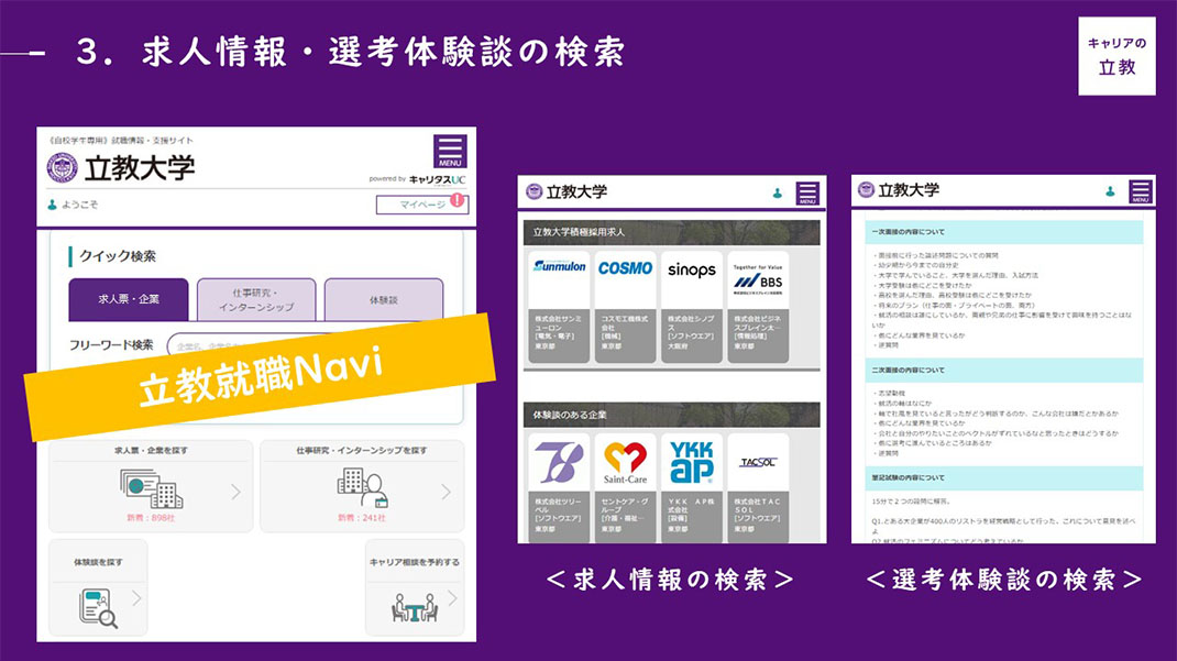 立教大学キャリアセンターでは、立教生のためだけのナビサイト「立教就職Navi」を独自に導入しています。「立教就職Navi」では他のナビサイトと異なり、立教大学への求人(立教生を求めている求人)を公務員・教員も含めて照会することが可能です。また、立教の先輩が後輩のために特別に書き残した、企業ごとの「選考体験談」を閲覧することも可能です。