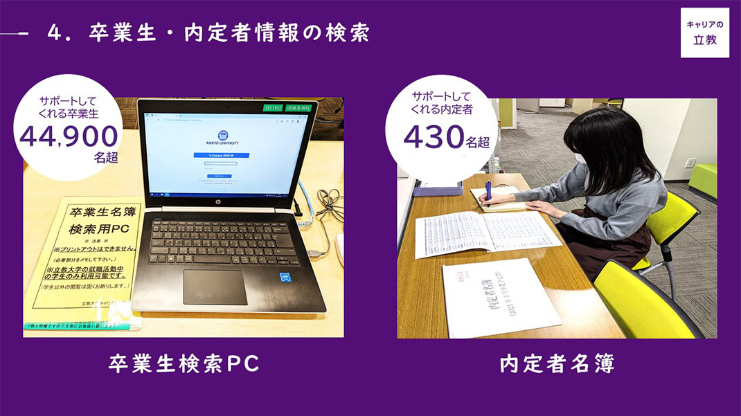 キャリアセンター内の専用PCで卒業生情報を検索・閲覧できます。現在、卒業生訪問のために連絡先を公開している卒業生数は約45,000人。企業名、職種、卒業年、所属学部学科などが登録されており、検索で対象を絞り込むことが可能です。話を聞きたいと思う卒業生を探し、直接アポイントを取ることができます。また、内定者の連絡先等をまとめた「内定者名簿(※)」も作成しており、毎年400名以上の内定者(学部4年生・院2年生)が協力してくれています。実は「内定者名簿」を作成している大学は珍しく、縦の繋がりを大切にする立教大学ならではのサービスといえます。志望企業に内定した先輩を探し、直接アポイントメントを取って話を聞くことができます。