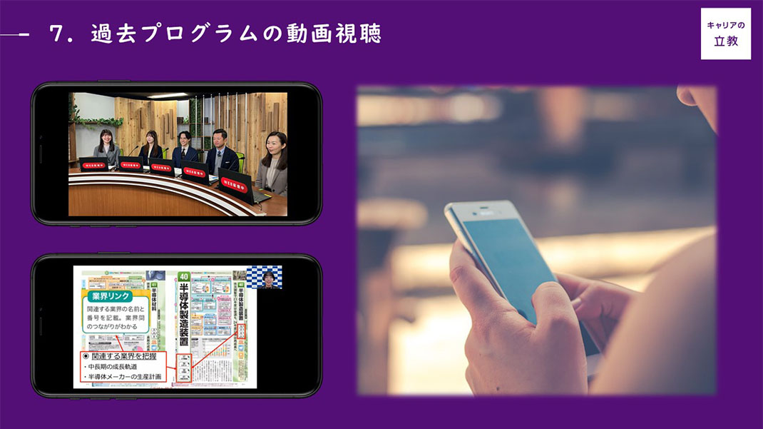 過去に実施したプログラムは、後日キャリアセンターWEBサイトで視聴することができます(一部プログラムを除く)。忙しい学生には嬉しい倍速再生やプログラム資料のダウンロードも可能です。当日参加できなかった学生や留学中の学生など、多くの学生が有効活用しています。