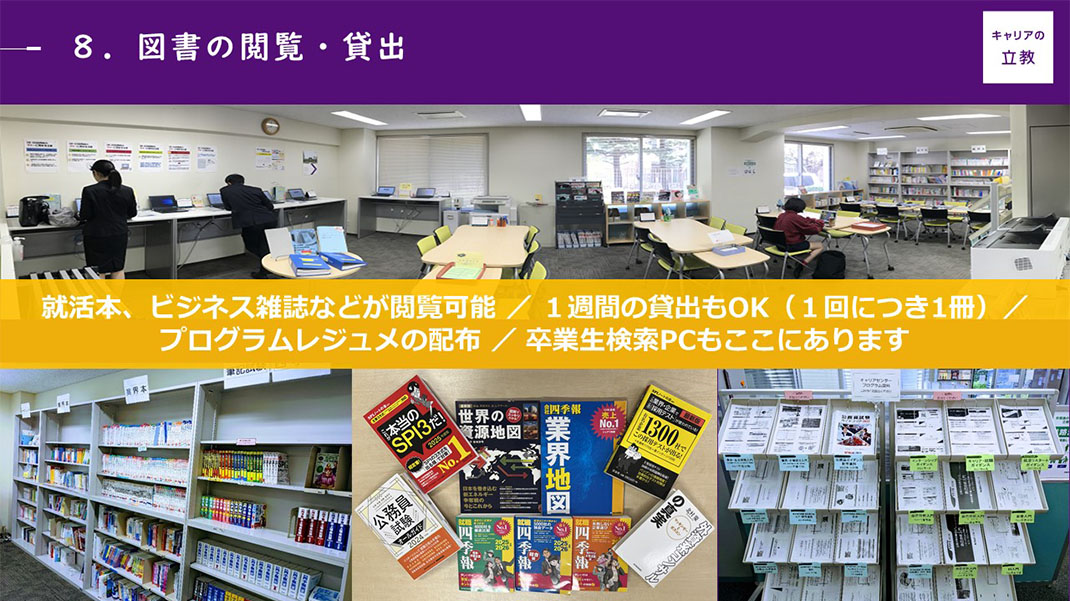 『業界地図』や『就職四季報』、テスト対策本、業界・職種対策本、ビジネス誌など、キャリアや就職に関するさまざまな書籍を用意しており、キャリアセンター内で自由に閲覧することができます。また1週間の貸出も行っており、多くの学生が利用しています。