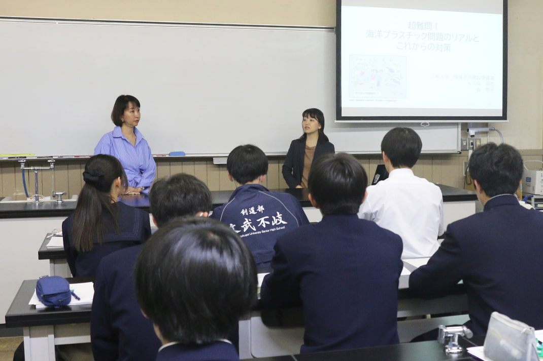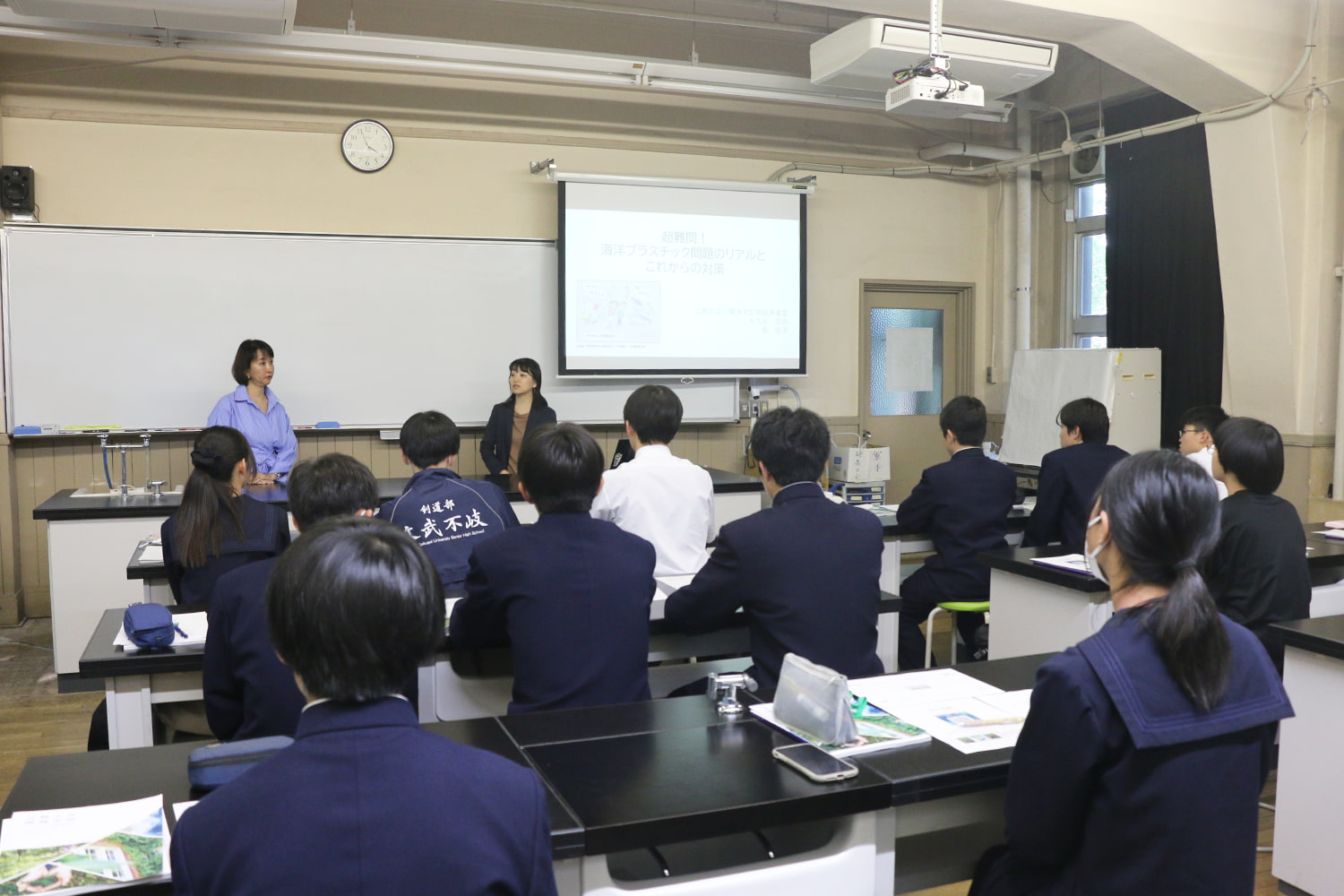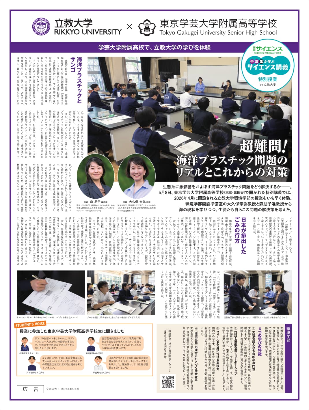 2026年4月に環境学部を開設する立教大学は、5月8日(木)に東京学芸大学附属高等学校(東京都)で特別授業を実施し、参加した生徒はいち早く環境学部の学びを体験しました。環境学部開設準備室の大久保奈弥教授、森朋子准教授が教壇に立ち、海洋生物学と環境工学の両側面から「超難問!海洋プラスチック問題のリアルとこれからの対策」のテーマで授業を行いました。