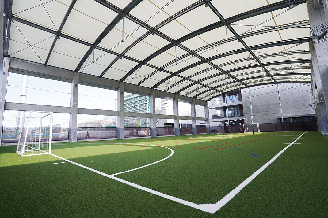 多目的コートはユリの木ホール※の建設中の代替施設として2004年に設置され、2023年まで授業やサークル等で利用されました。現在は、9号館の南側に全天候型多目的コートが設置されています。