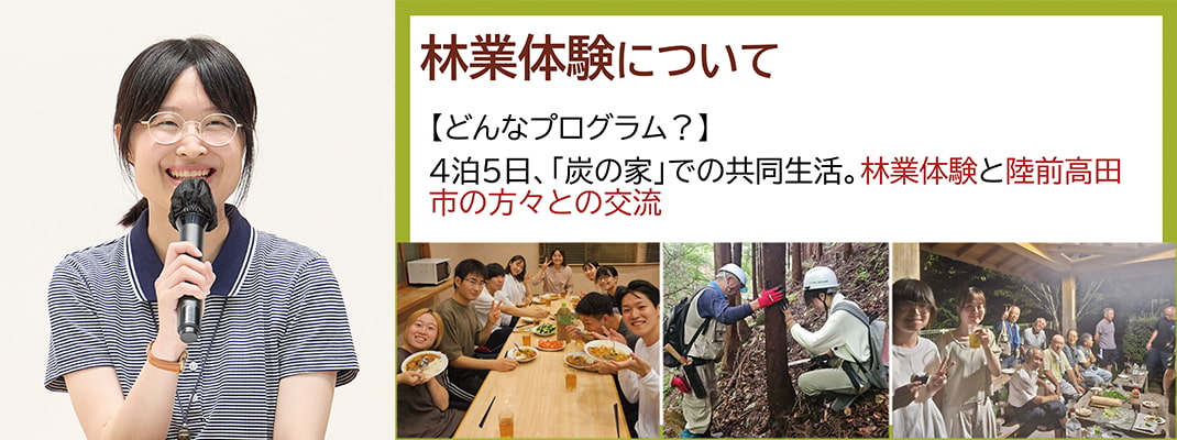 このプログラムでは現地の林業従事者や市職員の方々のご指導の下、実際に林業体験をさせていただき、自然との関わり方を学びました。他の参加学生と自炊共同生活を送りつつ、地元住民の方々との交流の機会にも恵まれました。強く心に残ったのは、東日本大震災で被害を受けた醤油会社を再建された河野和義さんのお話です。廃業を覚悟する中すぐに再建に向けて動き始めた息子さん、自分たちの活動を記事にしてくれた記者の方、その記事を見て支援をしてくれた方々など多くの人の支えがあったからこそ再建ができたと伺いました。そこから実感したのは「人とのつながりは財産である」「とにかく行動してみることが重要」ということ。東京に戻ってからも、林業体験で知り合った仲間とボランティア活動に取り組むなど、人とのつながりを大切にしながら、積極的に行動することを意識しています。