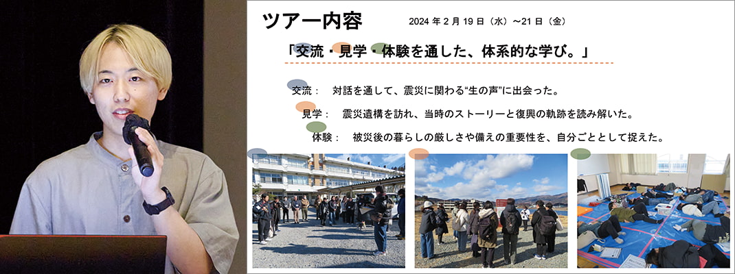 能登半島地震の被災地支援プロジェクトへの参加がきっかけで、もっと体系的に被災地復興について学びたいと考え、陸前高田交流ツアーに参加しました。2泊3日のプログラムの中で、「東日本大震災津波伝承館」の見学や仮設住宅での宿泊体験、防災食体験、地元住民の方々の講話など多くの貴重な経験を得ました。特に震災遺構である米沢商会ビル※の煙突に登り、そこで感じた風や眺めから震災の爪痕と復興の歩みを肌で実感できたことは強く印象に残っています。現場に立ち体験することで、震災を単なる知識としてではなく「自分ごと」として捉えられるようになりました。ツアーを通じて陸前高田市とは「過去の記憶を守りながら、未来の命を守ろうとするまち」であると思いました。自分も被災者の方々の声を受け取った一人としてそれを語り継ぐ責任を感じながら、できることに取り組んでいきたいです。