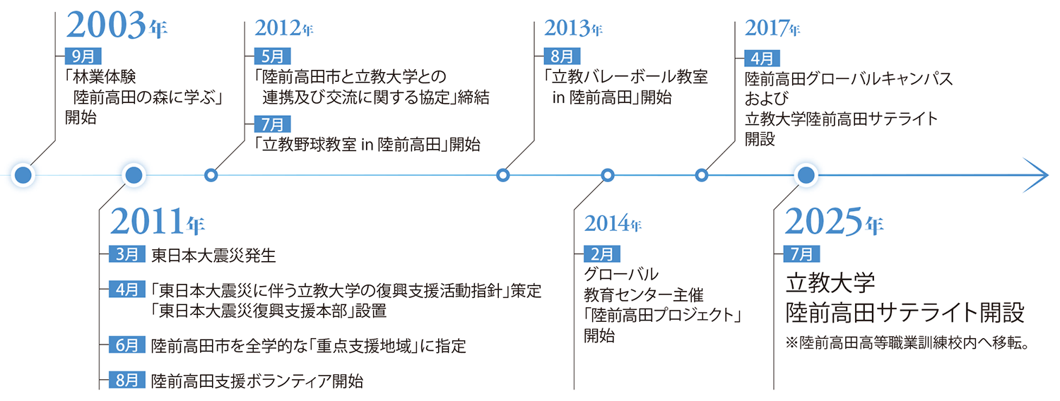 2003年から交流を始め、さまざまな形で連携を深めてきた岩手県陸前高田市と立教大学。これまで多くの学生がこの地で貴重な学びを得てきました。2025年7月、新たな交流活動拠点となる「立教大学陸前高田サテライト」を開設し、陸前高田での学びは新たなステージへ。立教学院の教育目標にある「共に生きる」を体現してきた陸前高田と立教の関係に迫ります。