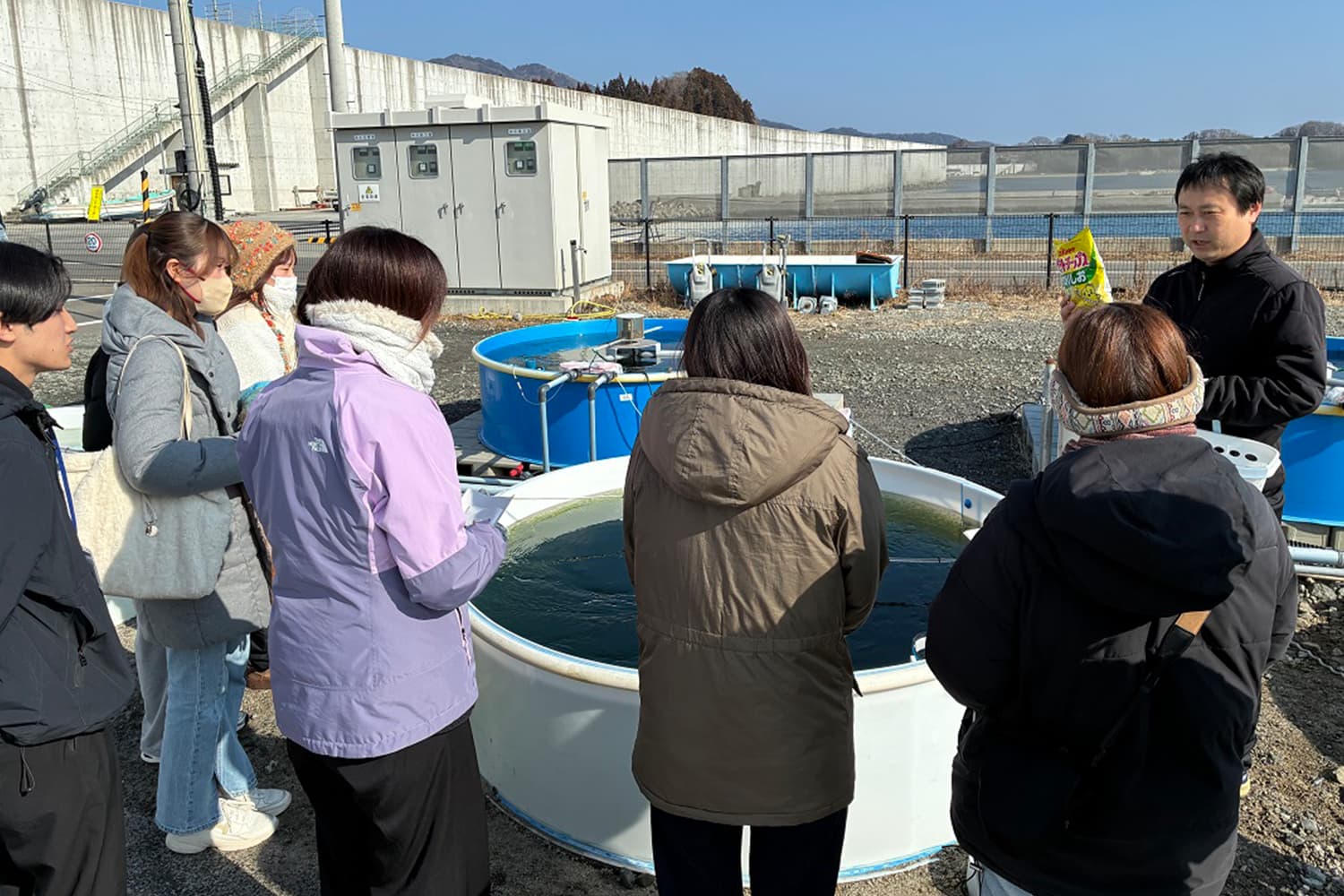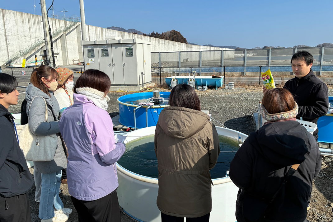 1日目は、理研食品(株)にご協力いただき、同社の施設である「陸前高田ベース」を見学しました。「陸前高田ベース」はスジアオノリやワカメの陸上養殖を行う研究・生産施設で、ご担当者様による説明のもと、陸上養殖の様子を見学しました。