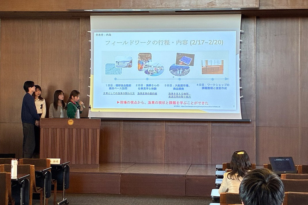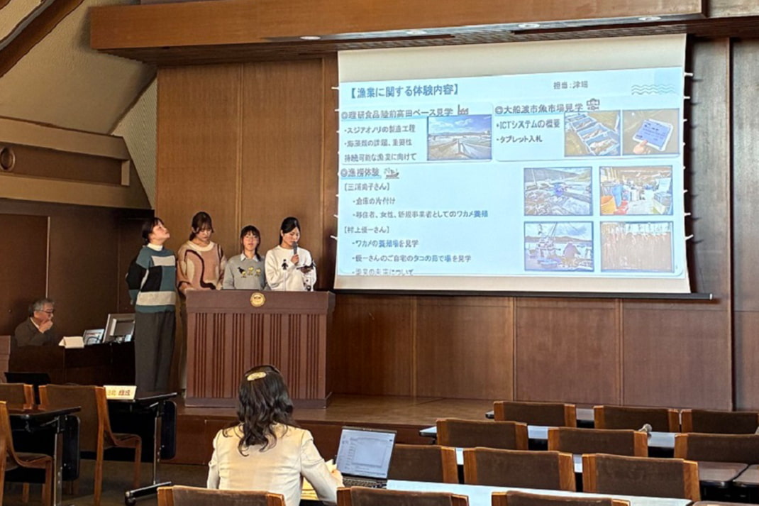 - 漁業の課題に対して、これまでは漁業従事者を直接増やすことが解決につながるのではないかと単純に考えていた。しかし今回の学びを通して、必ずしもその形だけではなく、地域に継続的に関わる人を増やす「関係人口」という考え方があることを知った。実際に地域を訪れたり、商品を購入したり、情報を発信したりするなど、さまざまな形で地域と関わることができると理解した。また、このイベントに参加した後は、環境問題や海の資源について日常生活の中でも意識するようになり、以前よりも関心を持つようになった。現地での体験を通して得た学びは、単なる知識ではなく、自分の考え方や行動にも影響を与えるものであり、非常に意義のある経験だったと感じている。(社会学部 2年次)