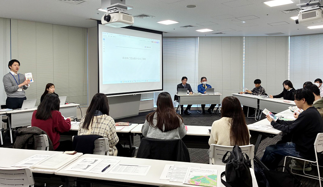 本学所在地である自治体等が直面する地域課題の解決に向けて、学生チームで事前調査やヒアリングを実施し、解決策を練り上げ、最終的に報告会において自治体や住民に提言を行う体験型プログラムです。本学の地域連携事業をより推進していくために、正課外プログラム(単位取得対象外)として実施します。学部や学年も様々な学生でチームを編成し、地域課題を深く考えることを通じて、地域理解の深化、自己成長に寄与する機会を提供します。