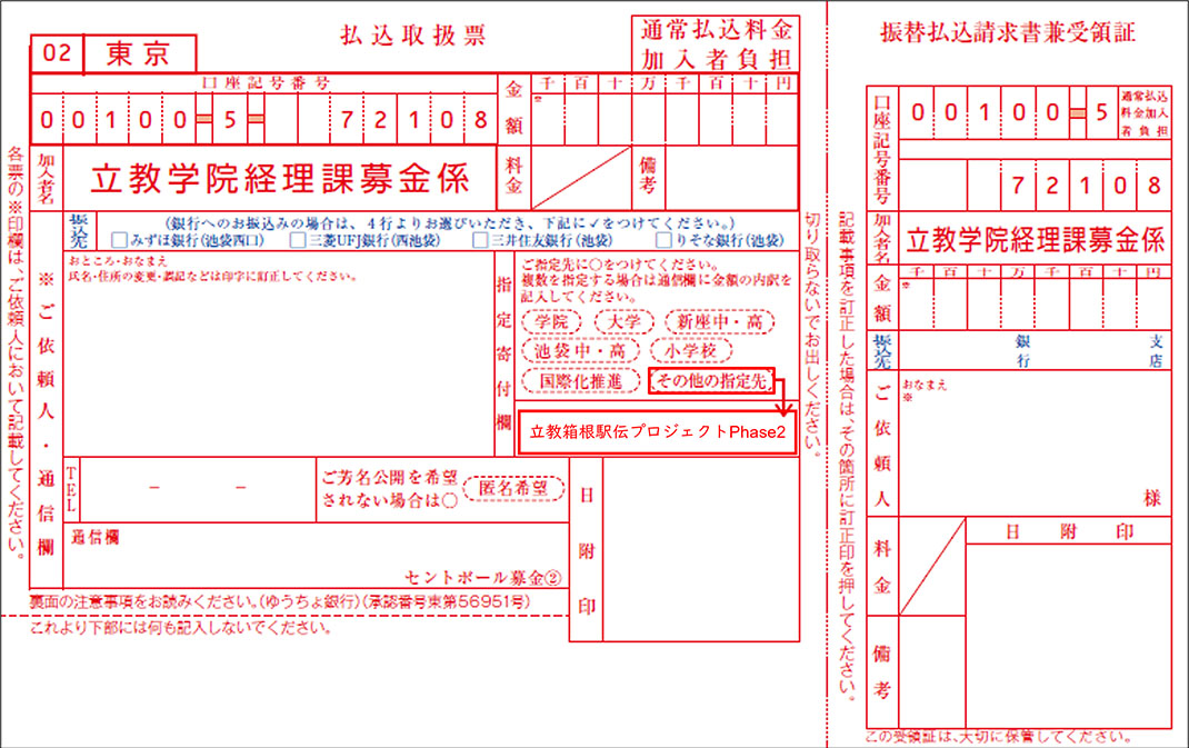 インターネットによるご寄付またはセントポール募金振込用紙(払込取扱票)にて、「立教箱根駅伝プロジェクトPhase2」をご選択・ご指定下さい。具体的な寄付方法は以下をご参照ください。