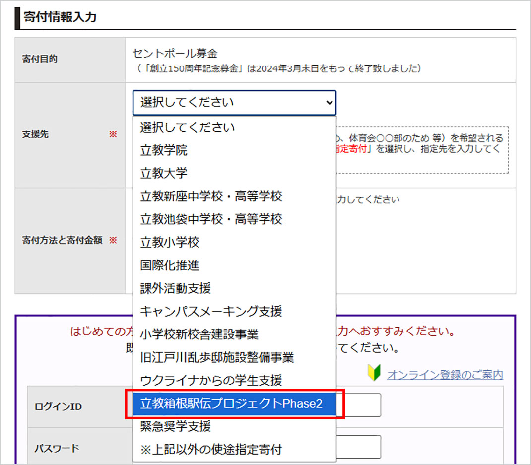 「寄付情報入力」ページで「立教箱根駅伝プロジェクトPhase2」をプルダウンで選択