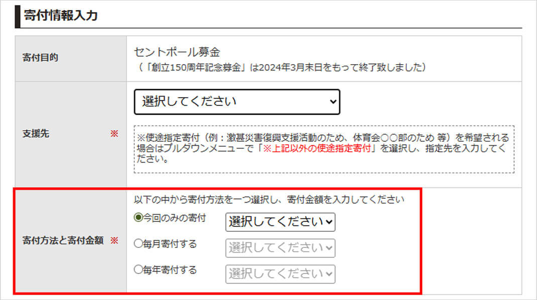 寄付方法を「今回のみの寄付」「毎月寄付する」「毎年寄付する」から選択し、寄付金額を選択。画面の案内に従って入力を進めてください。
