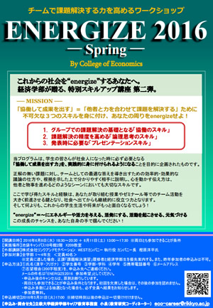 今年度最初の正課外キャリア教育プログラム『ENERGIZE2016-Spring』が、6月8日と11日の2日間にわたって開催されました。当プログラムは、社会人になった時に必ず必要となる「協働して成果を出す力」を、学生生活を通して実践的に身に付けられるようになることを目的に企画された講座です。具体的には、グループでの課題解決の基礎となる「協働のスキル」、真の課題を設定する「論理思考のスキル」、発表時に必要な「プレゼンテーションスキル」の3つのスキル獲得を目指します。