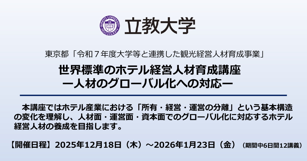 東京都では、観光関連事業者の経営力向上を図り、観光産業の活性化につなげることを目的として、大学等と連携して観光関連事業に従事する者等に向けた新たな教育プログラムの開発等の支援事業を実施しています。立教大学は2019年度より連携大学に選定されています。