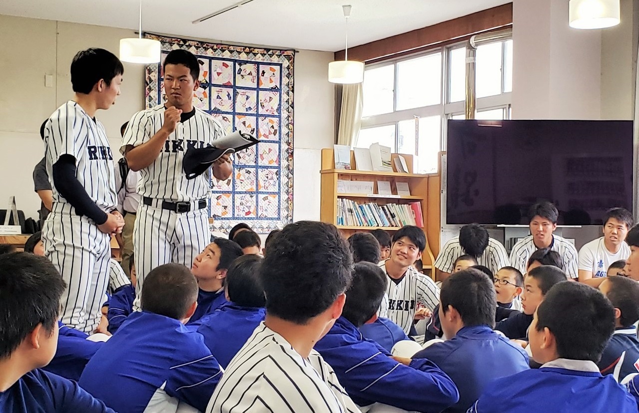 今回参加した立教大学野球部員の中には、中学時代、立教野球教室の存在を知って野球部に憧れ立教大学への進学を決めた学生もおり、地元の後輩に自身の経験から野球の楽しさを伝えました。