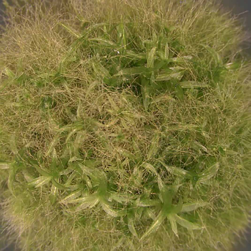 図1 ヒメツリガネゴケ/薄緑色の綿毛のように見えるのが平面的に成長する原糸体です。他方、その集まりから上に出てきている緑色の濃いものが茎葉体というシュートで、立体的な体の形づくりをしながら成長します。
