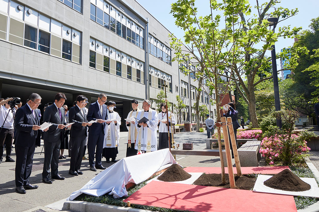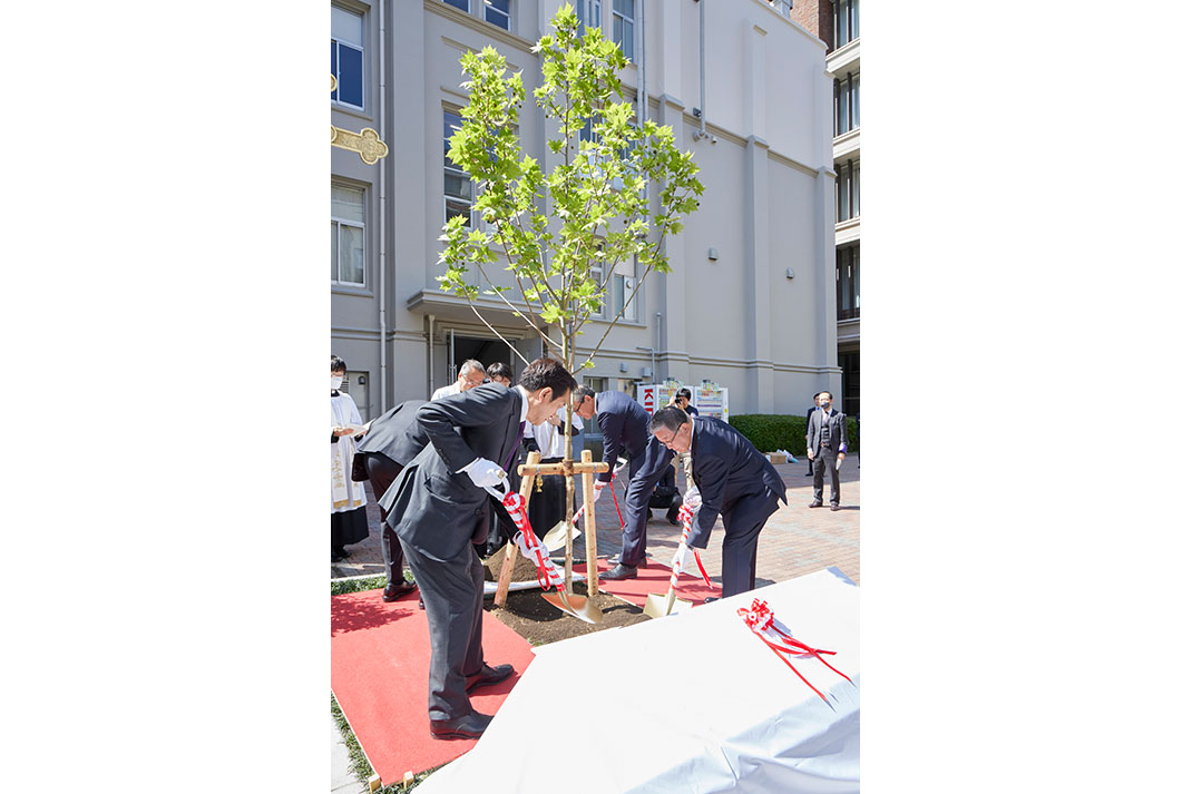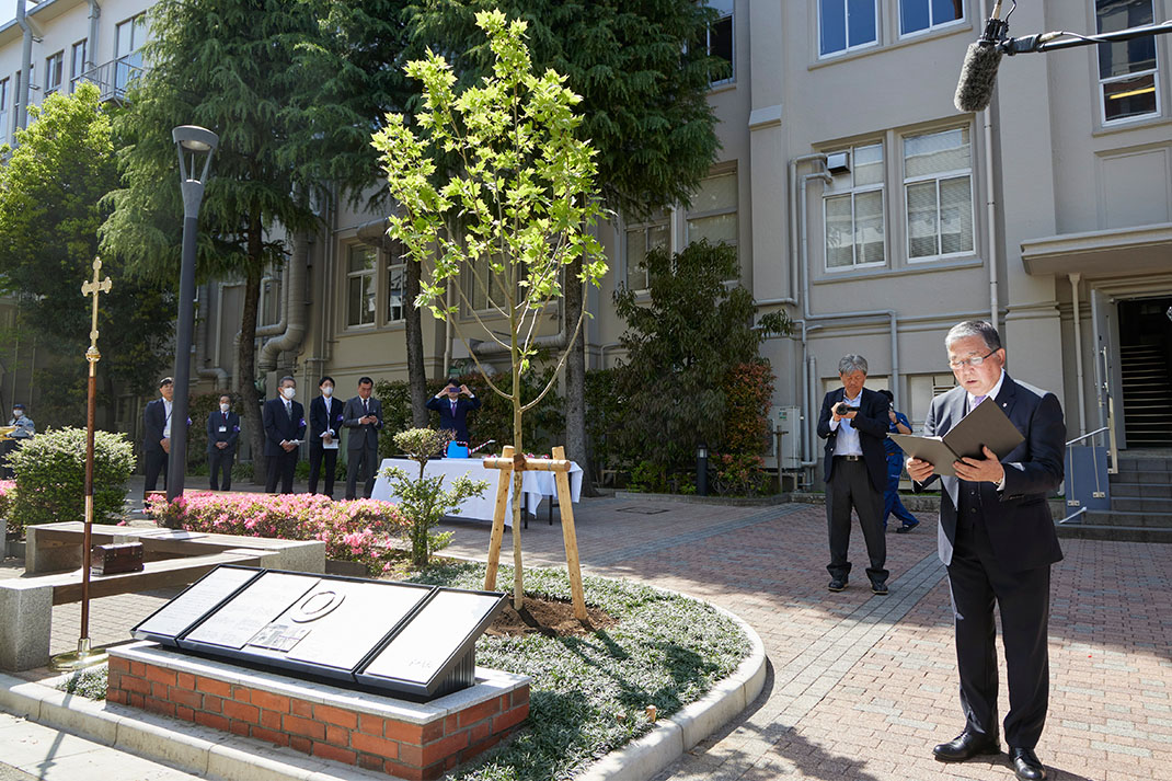 雲一つない晴天の日、池袋キャンパスにて最初に行われたイベントは、150周年を記念する植樹と、本学卒業生であり立教学院栄誉賞の受賞者である長嶋茂雄さん(読売ジャイアンツ終身名誉監督、1958年経済学部卒)の功績を讃える「長嶋茂雄氏顕彰モニュメント」の除幕式です。東京六大学野球で活躍する長嶋さんの姿に憧れて、本学への入学を決意したフリーアナウンサーの徳光和夫さん(1963年社会学部卒)が、長嶋さんからの「立教の後輩たちへ」のメッセージを代読。福田裕昭立教学院理事長、西原廉太立教学院院長・大学総長、村山修一立教大学野球部OB会長と共に、鈴懸の径 に新たなスズカケノキ(プラタナス)を植樹しました。続いて、体育会硬式野球部の部員らが顕彰モニュメントの除幕を行い、長嶋さんの略歴やメッセージが刻まれた銘板がお披露目されました。