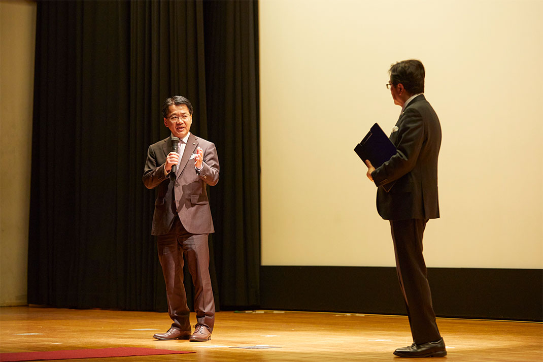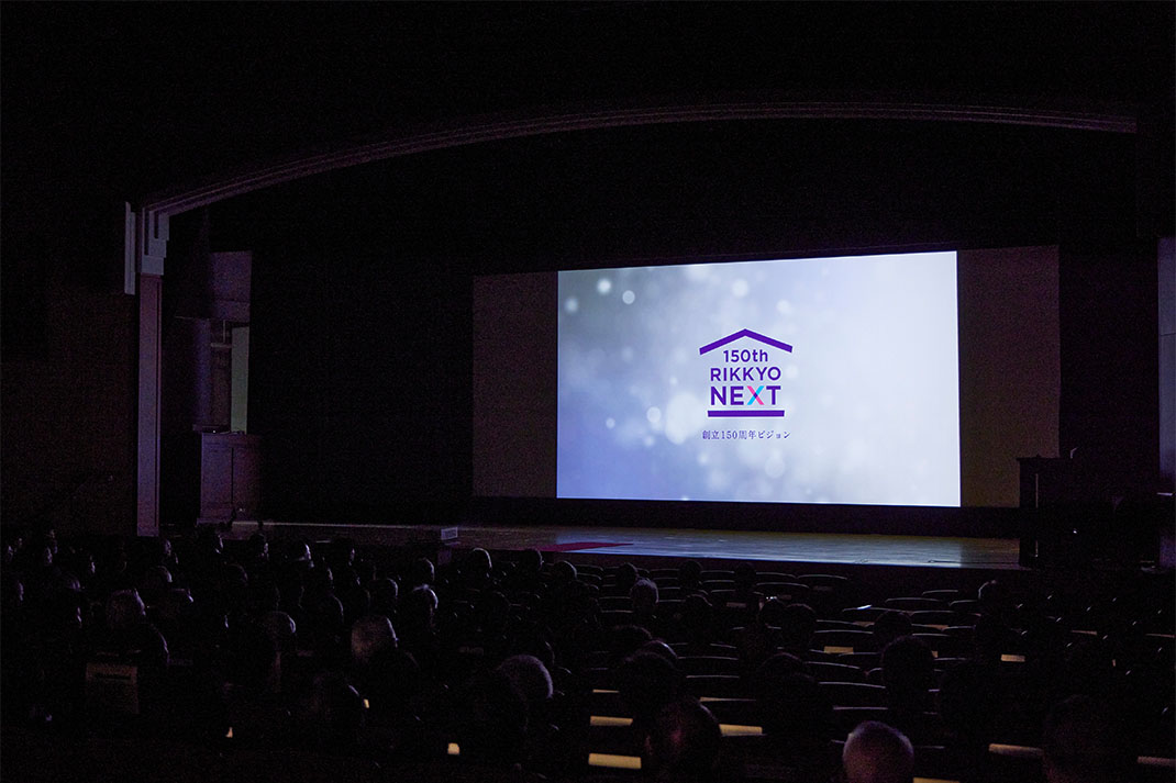 続いて、西原院長・総長がグローバル・リベラルアーツ・プログラム(Global Liberal Arts Program:GLAP)の発展と環境学部の新設構想(2026年4月予定)、「RIKKYO Learning Style 2.0」の展開などについて詳しく解説しました。また、同志社大学と立教大学の相互協力・連携に関する協定締結報告では、西原院長・総長と共に同志社大学の小原克博学長が登壇。1875年に新島襄によって創設されたキリスト教主義の大学であり、2025年に創立150周年を迎える同志社大学と立教学院に共通点を見いだし、パートナーとしてこれから果たすべき使命について語りました。さらに、映画監督の鶴岡慧子さん(2012年現代心理学部卒)が監督を務めた立教学院創立150周年記念映画『道のただなか』が上映されました。上映後には鶴岡監督も登壇し、作品にかけた思いを語りました。