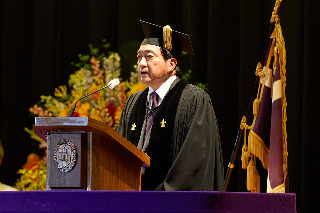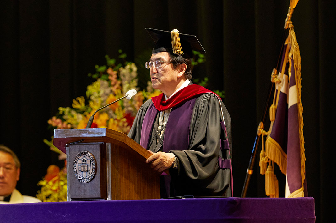 タッカーホールでは記念式典が執り行われました。第1部の冒頭は礼拝形式で厳粛な雰囲気の中で進行し、司会はフジテレビジョンの川端健嗣さん(1984年経済学部卒)が務めました。福田理事長、西原院長・総長が登壇し、立教学院の歴史や未来への思いを語り、それに続いて、ヴァージニア神学校イアン・マーカム学長、元統一部長官・聖公会大学元総長の李在禎氏、聖公会大学の金勍汶総長らが祝辞を読み上げました。
