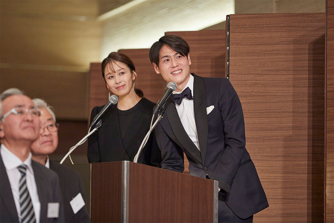 ホテルメトロポリタンに会場を移し、立教学院創立150周年記念祝賀会が行われました。司会を務めたのは、フリーアナウンサー上重聡さん(2003年コミュニティ福祉学部卒)とTBSテレビアナウンサー良原安美さん(2018年経済学部卒)。