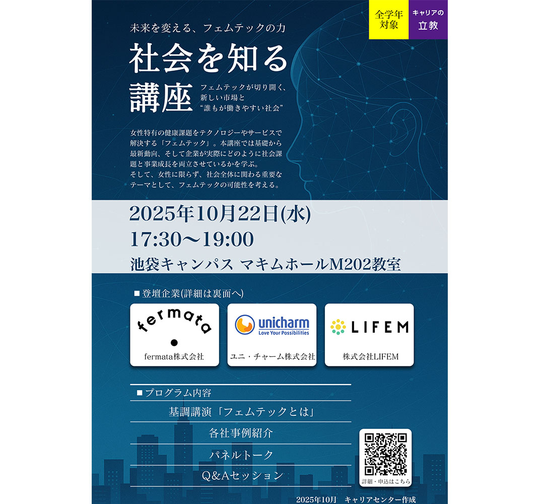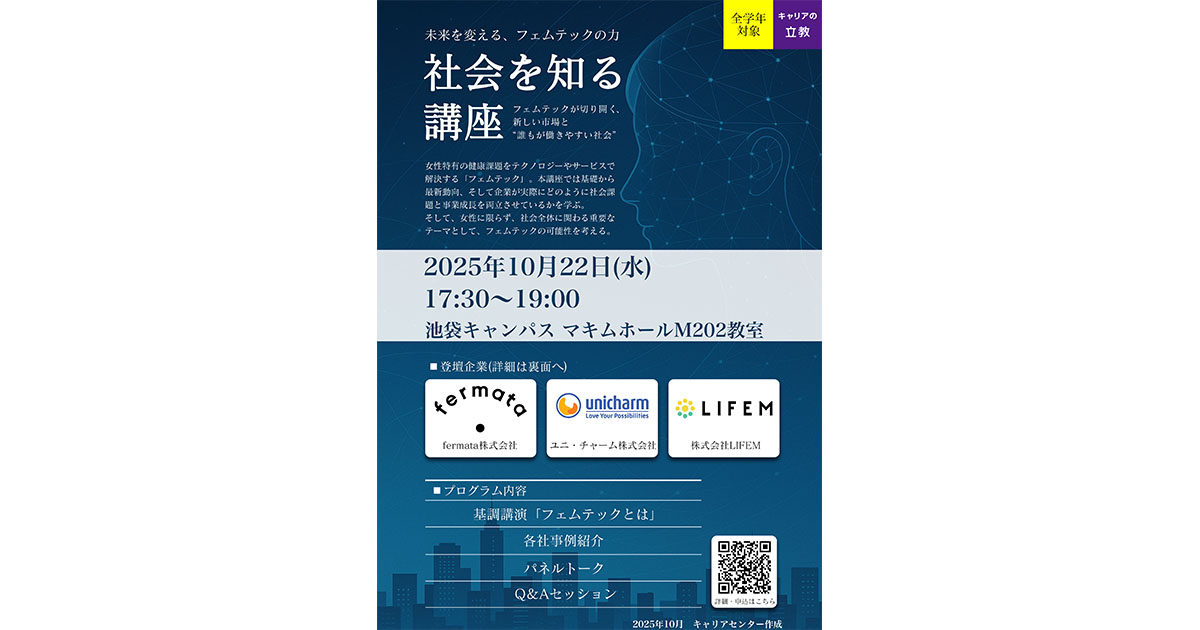 立教大学(東京都豊島区、総長:西原廉太)は、10月22日(水)に『社会を知る講座~フェムテックが切り開く、新しい市場と“誰もが働きやすい社会”~』を池袋キャンパスで開催します。