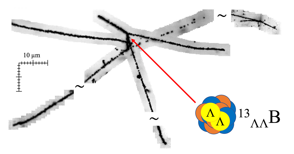 しかし、その生成の希少さと二つのラムダ粒子が連続して崩壊する構造の複雑さから、ダブルラムダハイパー核の検出は非常に困難です。現状唯一の直接検出方法は、写真フィルムにダブルラムダハイパー核の生成と崩壊に伴う飛跡を記録し、それを顕微鏡で読み取るという「写真乾板[10]」を用いた手法です。これまで50年以上にわたりこの技術による探索が行われ、生成・崩壊に伴う飛跡によって三つの分岐点を持つ事象の候補が40例程度検出されています。しかし、「どのような種類の原子核に二つのラムダ粒子が束縛されていたか」という同定解析では、考えられ得る全ての粒子と崩壊の組み合わせを考慮し、整合する候補を絞り込む必要があります。ほとんどの場合、複数の候補が残ってしまうため、歴史上で同定できたのはヘリウム原子核[8]にラムダ粒子が二つ束縛されたヘリウム6ダブルラムダハイパー核の1例のみでした注1)。
