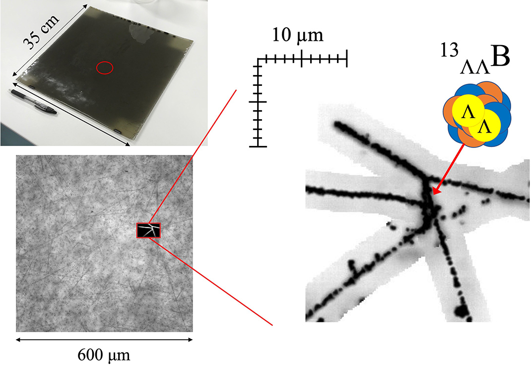 J-PARCでの実験でK中間子ビームが照射された写真乾板(左上)と、光学顕微鏡によって撮影した拡大画像(左下)。拡大画像に写る黒い線は飛跡と呼ばれる荷電粒子が通った痕跡で、写真乾板1cm2当たり約100万本の飛跡が記録されている。黒の背景に白く飛跡が強調されている部分が深層学習によってダブルラムダハイパー核事象の候補を捉えた場所。より高倍率な対物レンズを用いて観測することでダブルラムダハイパー核の生成・崩壊に関連する飛跡がつくる三つの分岐点を持つ事象が観測された(右)。13ΛΛB:ホウ素13ダブルラムダハイパー核。
