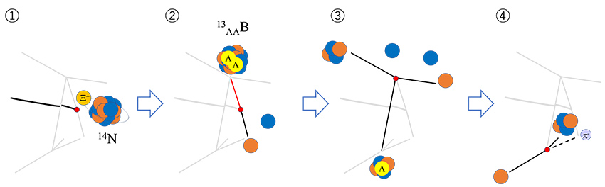 ①~④の生成・崩壊について、考え得る全ての組み合わせを調査し、整合性を確認することで生成されたダブルラムダハイパー核の種類を同定することに成功した。オレンジの丸:陽子、青色の丸:中性子、黄色の丸:ラムダ粒子、薄紫の丸:π(パイ)中間子、赤丸:反応点。中性子は電荷を持たないため、飛跡として観測されない。
