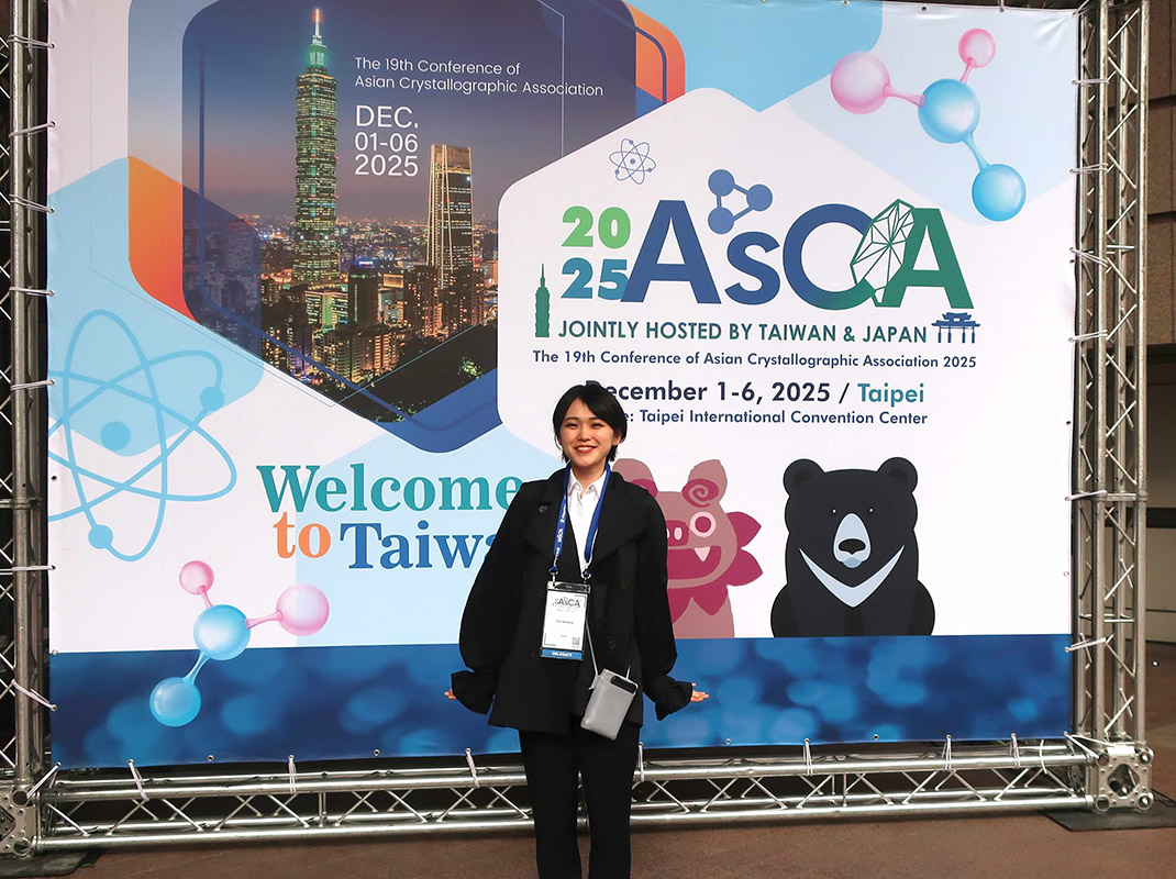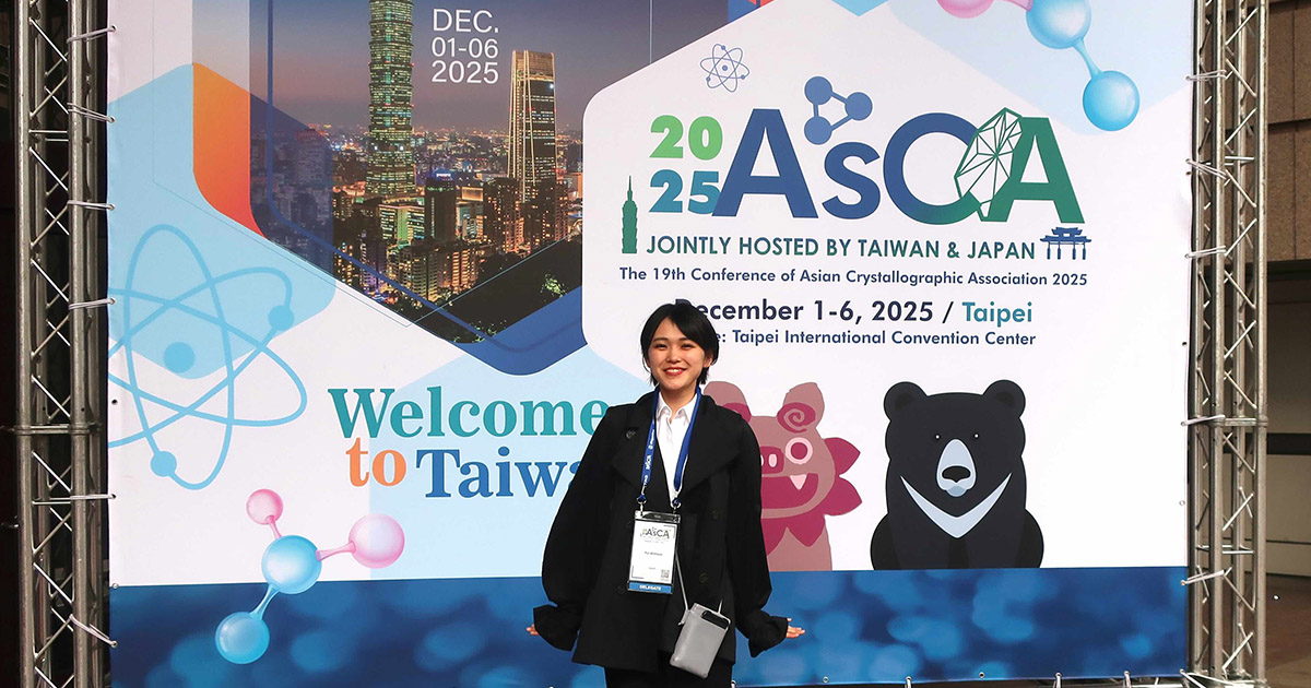12月1日(月)~12月6日(土)に台湾の台北国際コンベンションセンターで開催されたAsCA2025(the 19th Conference of Asian Crystallographic Association 2025)において、理学研究科化学専攻博士課程後期課程2年次の若狹優惟さん(有機元素化学・箕浦真生研究室)が、結晶工学と高反応性化学種の速度論的安定化の手法を融合させた研究成果を発表し、「Rising Star Award(若手優秀口頭発表賞)」を受賞しました。