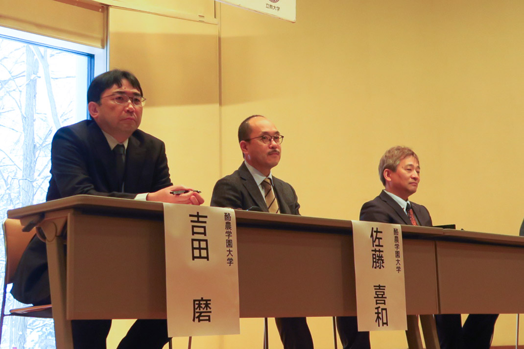 両大学の教員によるパネルディスカッション(左から:酪農大 吉田磨教授、佐藤喜和教授、岩野英知学長)