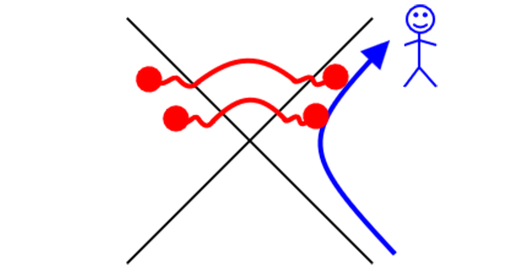 図3:加速観測者の複雑性の増加の模式図。単位時間に左右のもつれ(有効温度)が増え、片方がリンドラー粒子(赤い点)として放出され、複雑性を増加させる。