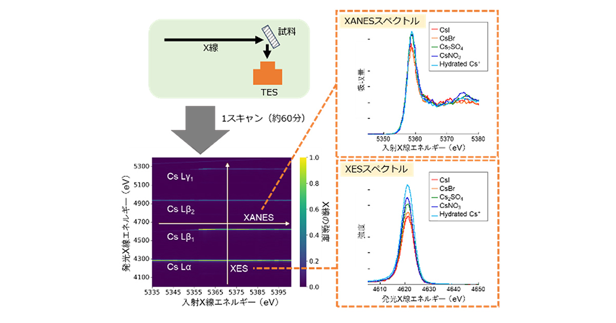 日本原子力研究開発機構システム計算科学センターの山口瑛子研究副主幹(兼: 東京大学大学院理学系研究科 客員共同研究員)、奥村雅彦研究主幹、立教大学大学院理学研究科の山田真也准教授、理化学研究所仁科加速器科学研究センターの橋本直理研ECL研究チームリーダー(兼: 理研開拓研究所 理研ECL研究チームリーダー)、東京都立大学理学研究科の奥村拓馬准教授、東京大学大学院理学系研究科の高橋嘉夫教授(兼: 同大学アイソトープ総合センター センター長)らによる研究グループは、超伝導転移端検出器(以下、TES)(注1)を用いた蛍光X線の高エネルギー分解能測定による分析を行い、セシウム(以下、Cs)のX線吸収スペクトルの高エネルギー分解能化に成功しました。この方法により、より詳細なCsの化学状態の推定が可能であることを明らかにしました。
