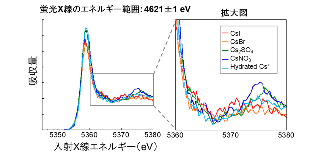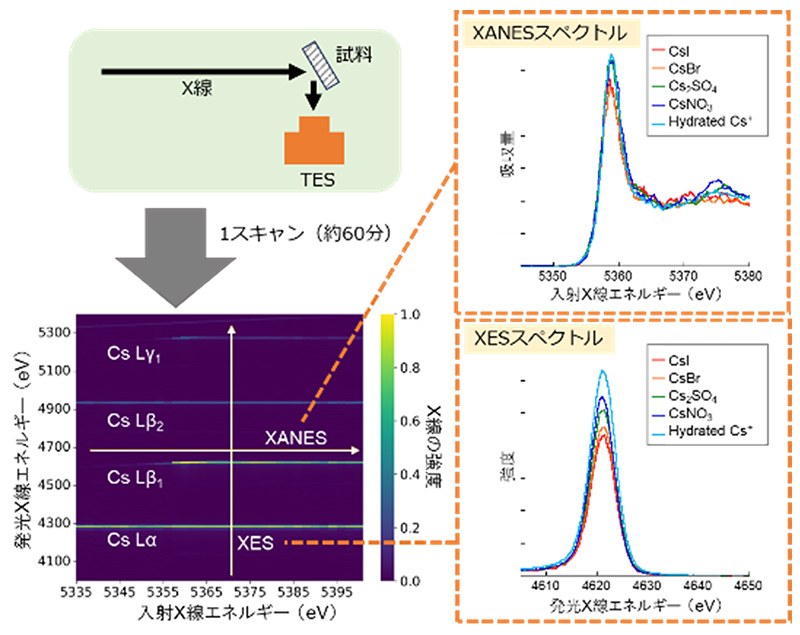 - 超伝導転移端検出器(TES)を用いた高エネルギー分解能の蛍光X線分析により、X線吸収スペクトルのより微細な構造を検出し、セシウムの化学状態を詳細に推定しました。
