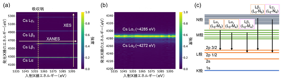 Cs含有試料にX線を照射し、吸収端(注5)の前後で入射X線のエネルギーを少しずつ変化させながら、蛍光X線をTESで検出しました。これにより、入射X線エネルギー、発光X線エネルギー、そして発光X線の強度、の三次元のデータを1回の測定で得ることができました(図1a)。この三次元データを水平方向に切り取ることでHERFD-XANESスペクトルを得ることができ、一方、この三次元データを垂直方向に切り取ることでX線発光スペクトル(以下、XES)(注6)を得ることができます。