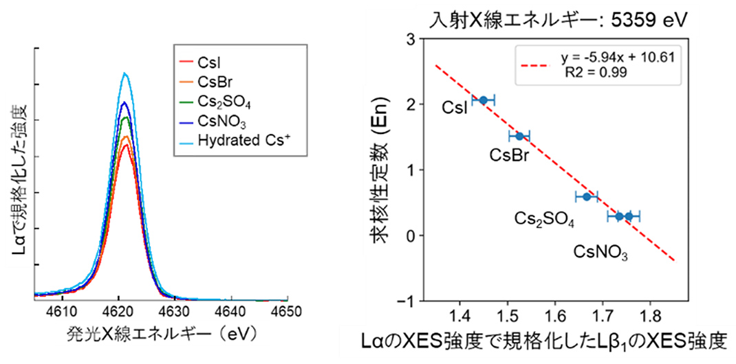 HERFD-XANESスペクトルでは、Cs化合物に応じて異なる特徴が見られました(図2)。これらの違いはCs化合物の結合性の違いに由来すると考えられます。Cs化合物間の違いは、XESスペクトルでも確認されました。蛍光線Lβ1のXESスペクトルの強度をLα1の強度で規格化したところ、各化合物の求核性定数Enと強い相関が見られました(図3)。Enは共有結合性を定量化した指標であるため、今後、未知試料についても測定を行うことで共有結合性の定量ができると考えられます。こういった化合物間の違いは、RIXSマップ(図4)でも見られました。