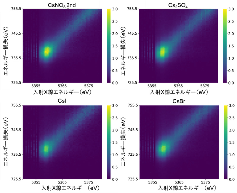 図4: Cs Lβ1のRIXSマップ 化合物によって散乱X線の強度やその分布が異なる