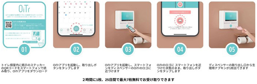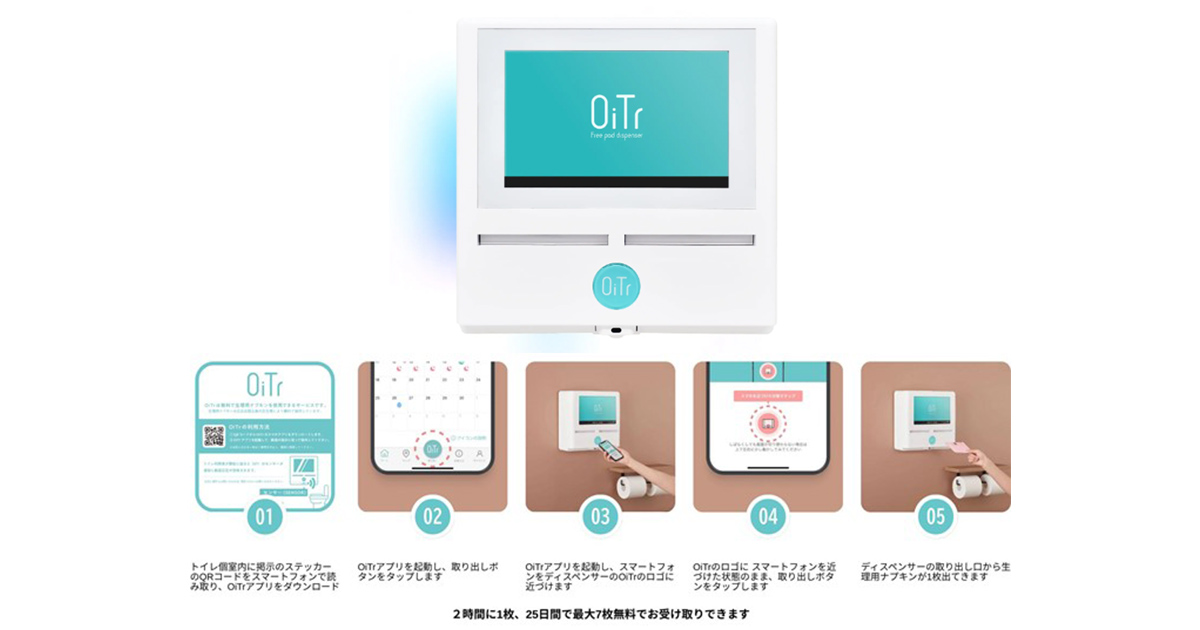 「OiTr(オイテル)」は、個室トイレ内に設置された専用ディスペンサーから、スマートフォンアプリを通じて生理用ナプキンを無料で提供するサービスです 。生理のある人の約9割が「予期せぬ生理」を経験しているという調査結果があり、突発的な事態や持参忘れにより困難な状況に直面する学生が一定数存在します 。また、経済的な理由で生理用品の入手が困難な「生理の貧困」への対応も喫緊の課題となっています 。近年、複数の学生から当該サービス導入の要望を受けており、本学では、こうした学生の心理的・経済的負担を軽減し、ウェルビーイングを向上させることは重要な学生支援のひとつであると考え、今回の導入を決定いたしました 。