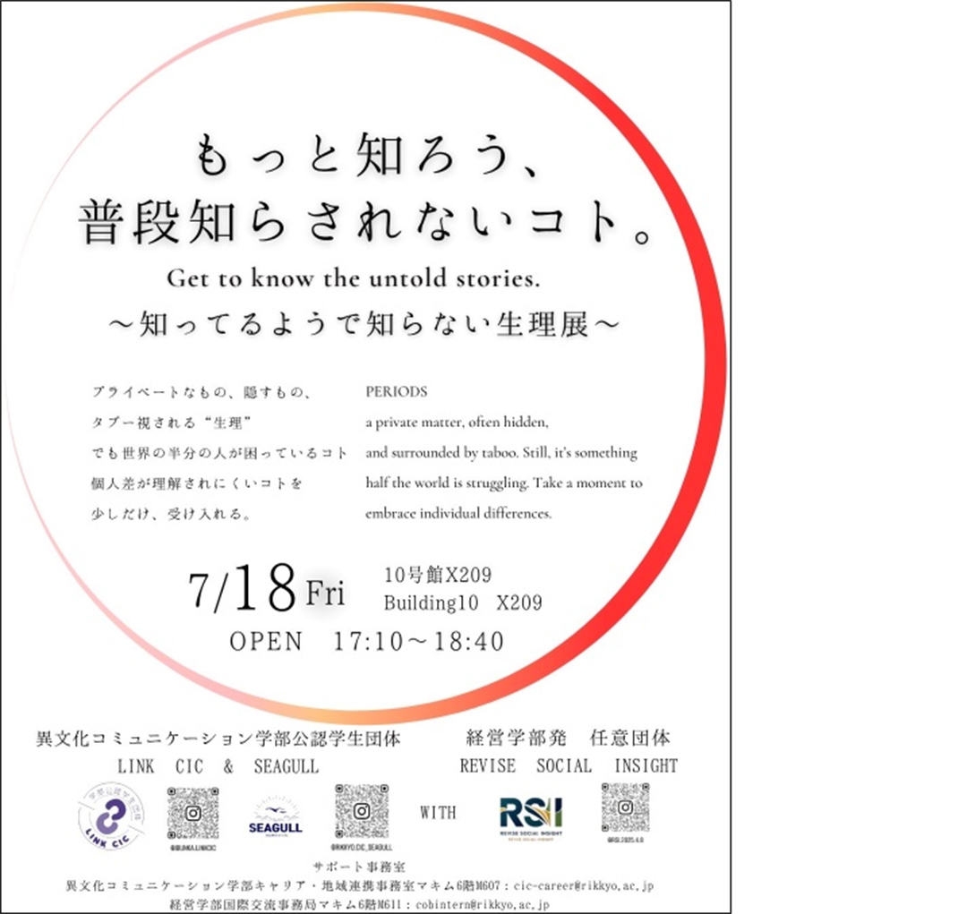経営学部発の任意団体RSIは異文化コミュニケーション学部公認学生団体 LINK CICおよびSEAGULLと共同で、生理に対する社会的なタブー視や心理的障壁を取り除くことを目的に学内で「生理展」を開催しました。展示では、生理に関する基本的な知識や世界の多様な生理用品の紹介に加え、学生たちの「リアルな声」を可視化。匿名の付箋を用いたディスカッション形式を取り入れることで、普段は言葉にしにくい悩みや意見を共有し合える場を創出しました。また、SRHR(性と生殖に関する健康と権利)や生理痛への理解を深めることを目的にワークショップを開催するなど、対話を通じて「生理」を社会全体で理解すべきテーマとして再定義し、相互理解の深いキャンパスコミュニティの醸成に寄与しています。