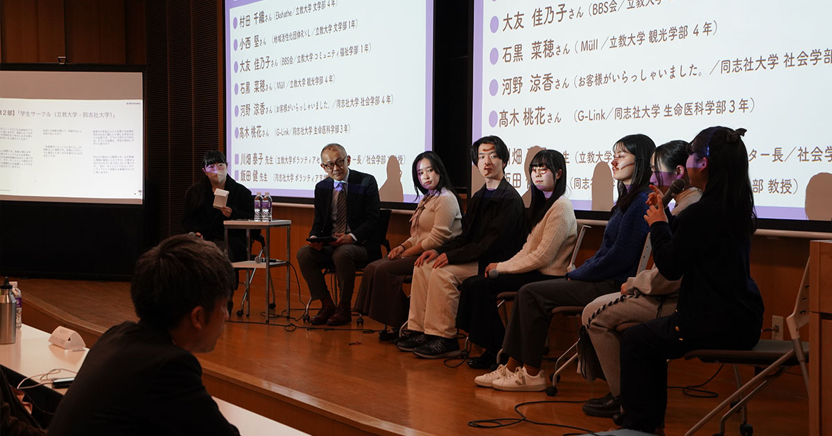 第2部では、両大学のボランティアサークル(立教大学4団体・同志社大学2団体)が、2025年度の活動内容やその成果、直面している課題、活動を通じて得た気づきについて発表しました。続くトークセッションでは、両大学の教員が聞き手を務め、「なぜ、ボランティアなのか」というテーマをさらに深掘りしました。
