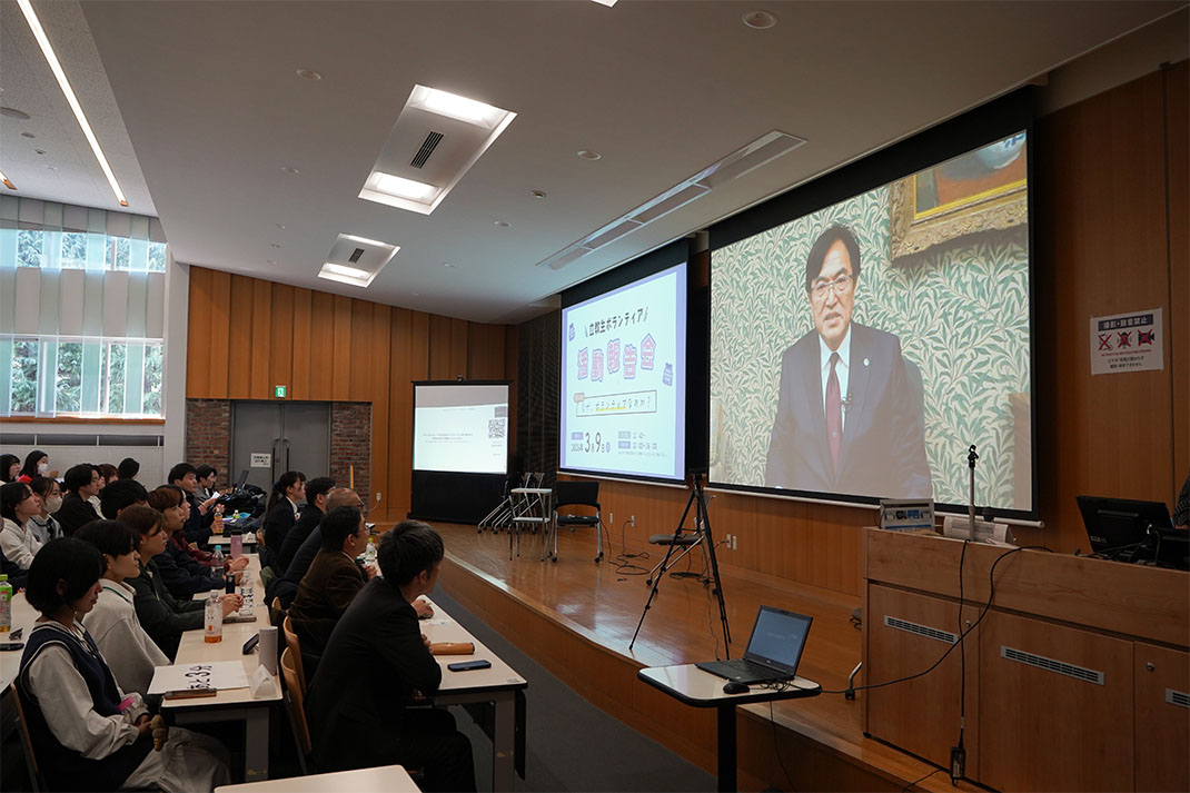 開会にあたり、本学の西原総長よりビデオメッセージが寄せられました。続いて、同志社大学の小原学長より、報告会のテーマである「なぜ、ボランティアなのか」に寄せてビデオメッセージをいただきました。